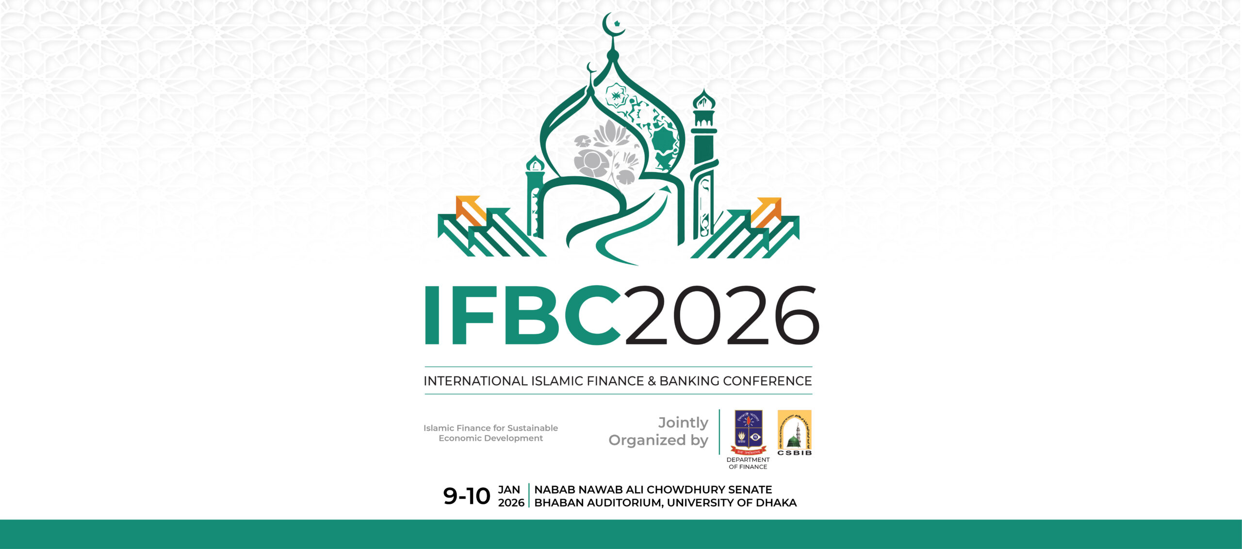 The International Islamic Finance & Banking Conference (IIFBC) 2026, themed on Islamic Finance for Sustainable Economic Development is a national flagship program designed to advance the development, credibility, and global positioning of the Islamic, finance industry in Bangladesh, jointly organized by the Department of Finance, University of Dhaka and Central Shariah Board for Islamic Banks of Bangladesh (CSBIB). The conference brings together regulators, scholars, industry experts, policymakers, Shariah advisors, and financial innovators on a unified platform. Through high-level policy dialogues, academic research presentations, knowledge-sharing sessions, and interactive networking opportunities, IIFBC 2026 aims to promote responsible finance, strengthen institutional collaboration, and inspire innovation across the Islamic banking and finance ecosystem.